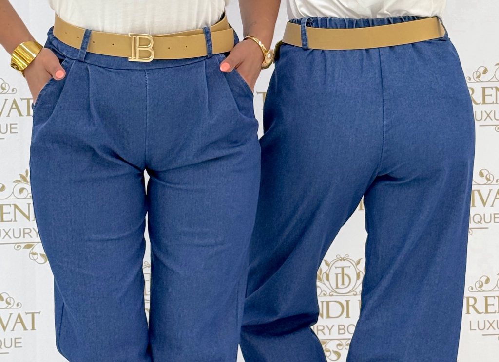 Be the first to review “Denim-effect pants with rubber waist & bottom, gift belt”
