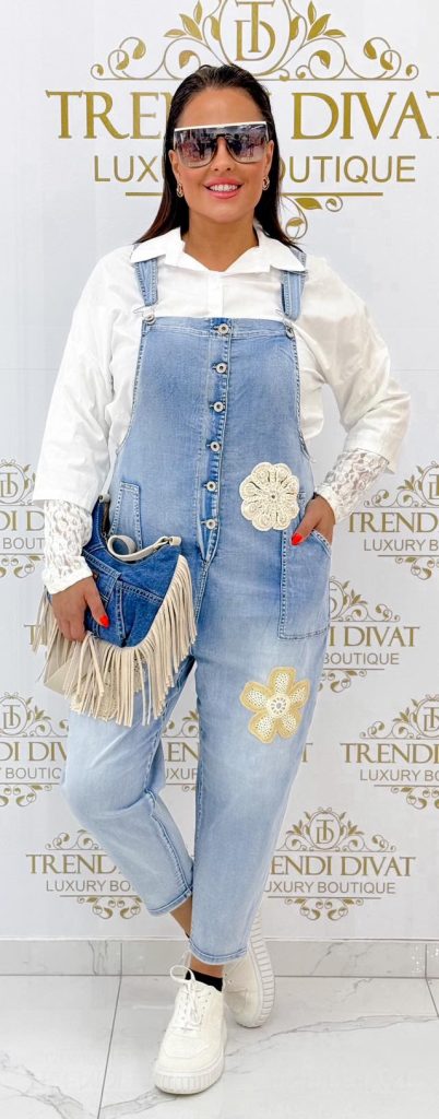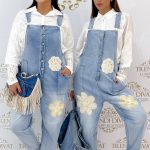 Denim overalls decorated with crocheted flowers, bridle “SW2007”