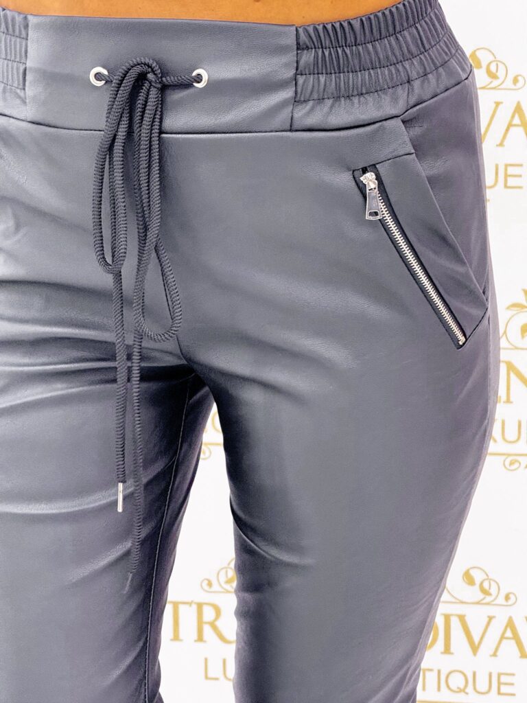 Faux leather pants with an elastic waist, zipper on the legs and pockets