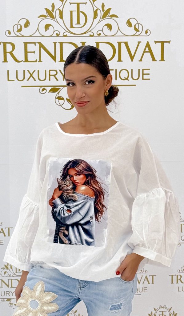 Loose-fitting, loose linen material, rubberized bottom, top with a feminine cat pattern