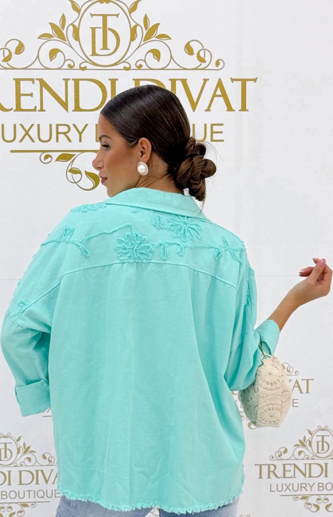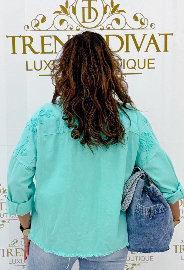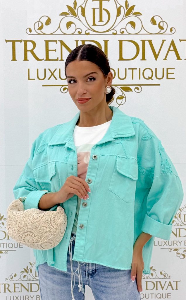 Mint-colored denim jacket with a flower pattern on the top, loose fit