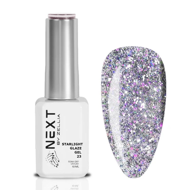 Next by Zellia Starlight Glaze Gel is a special, intensely shimmering gel polish that evokes the glow of the starry sky. The base of the formula is a platinum-effect base, which is complemented by extreme glitter glitter particles, giving the nails a spectacular, brilliant appearance.