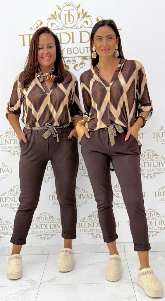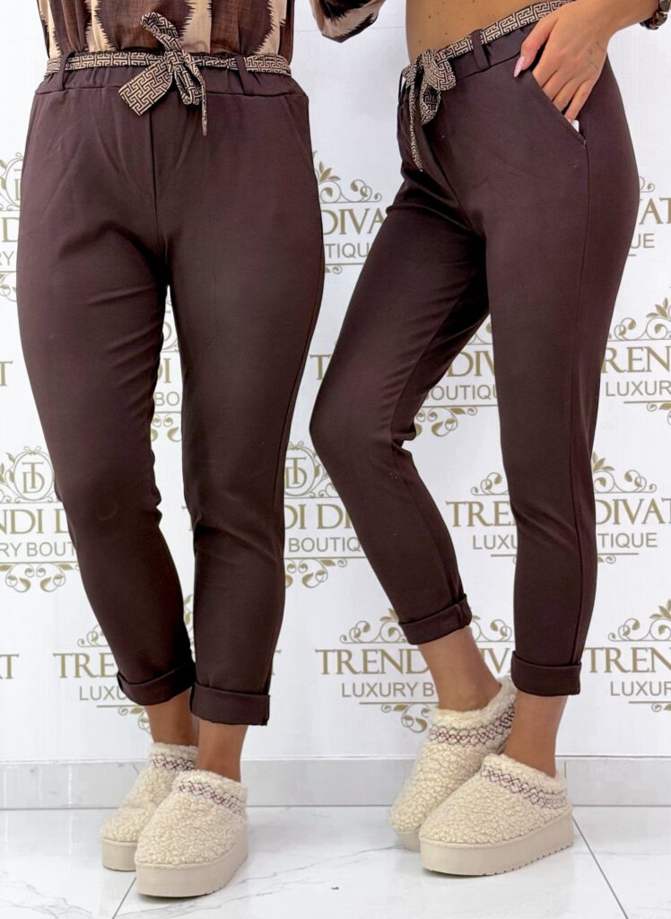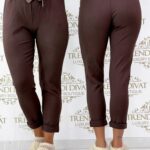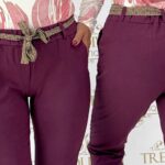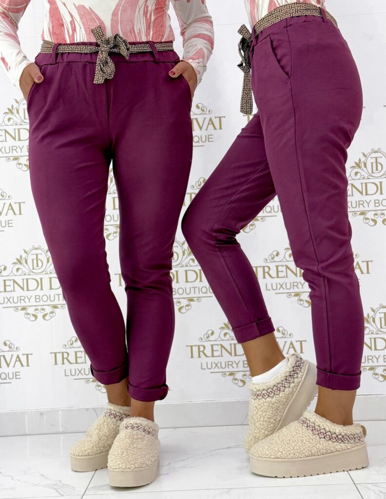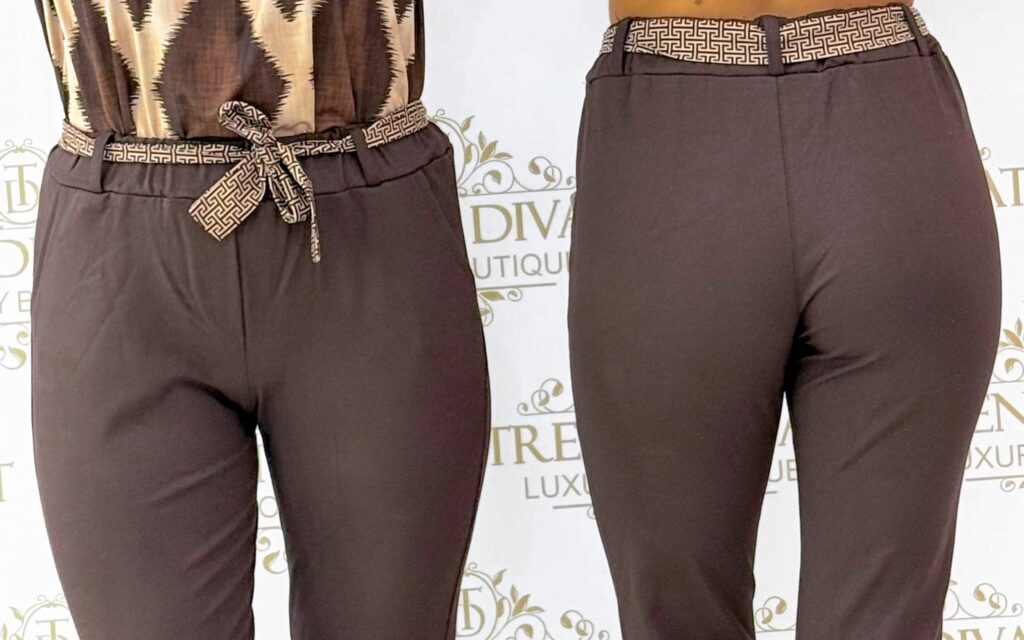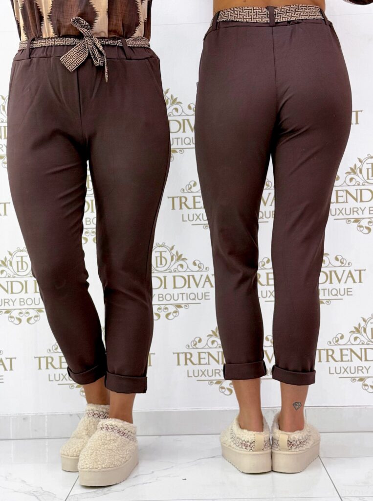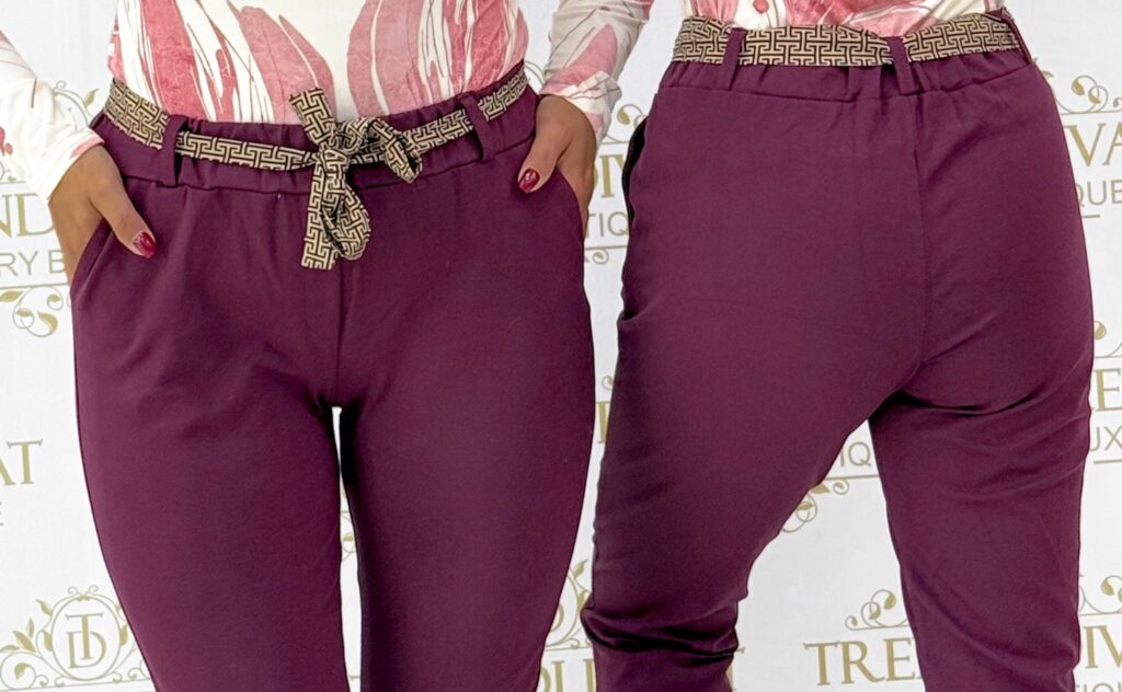 Be the first to review “Pants made of elastic material with a rubber waist, with a patterned tie belt”