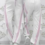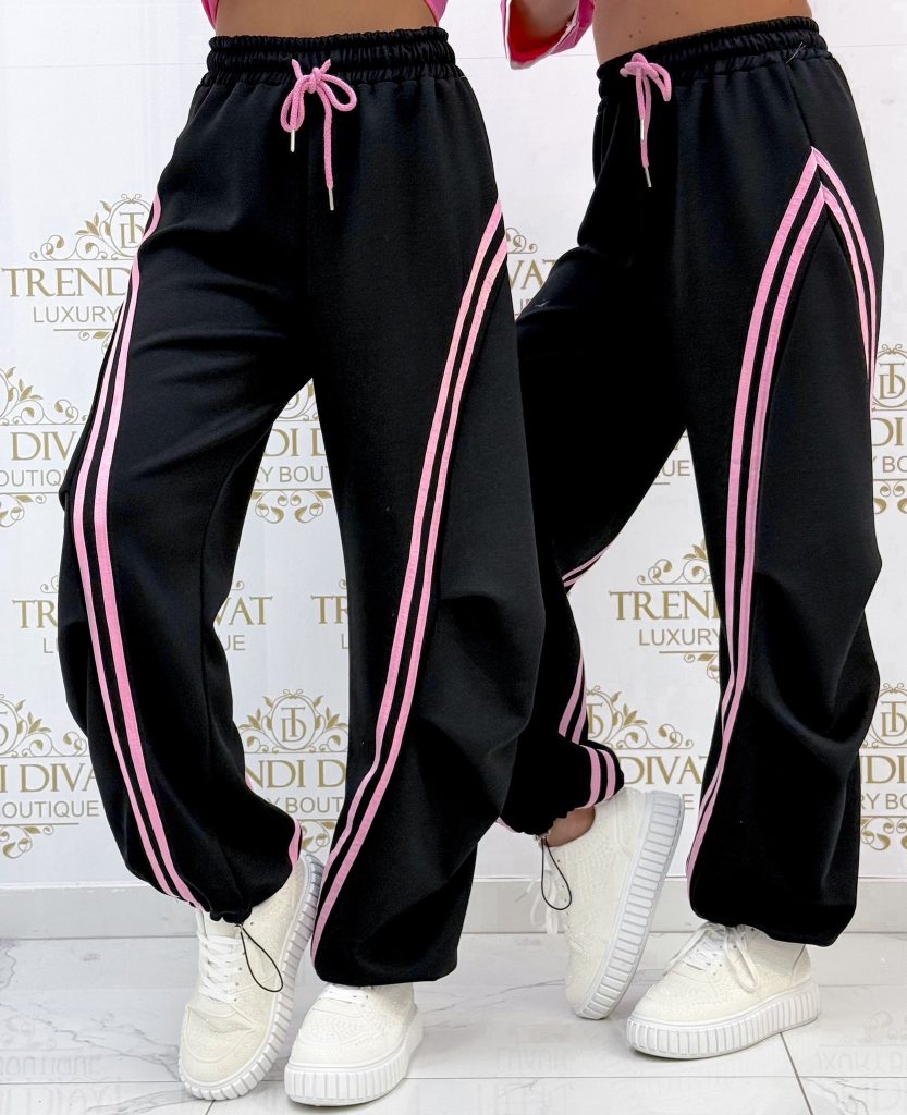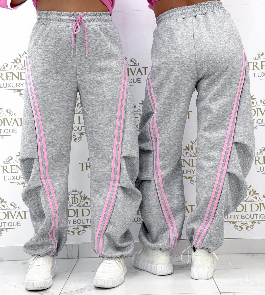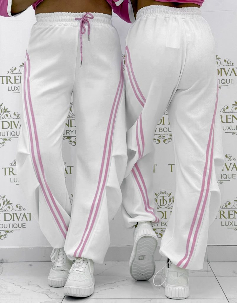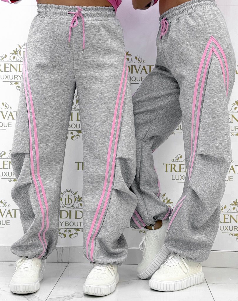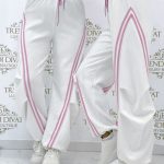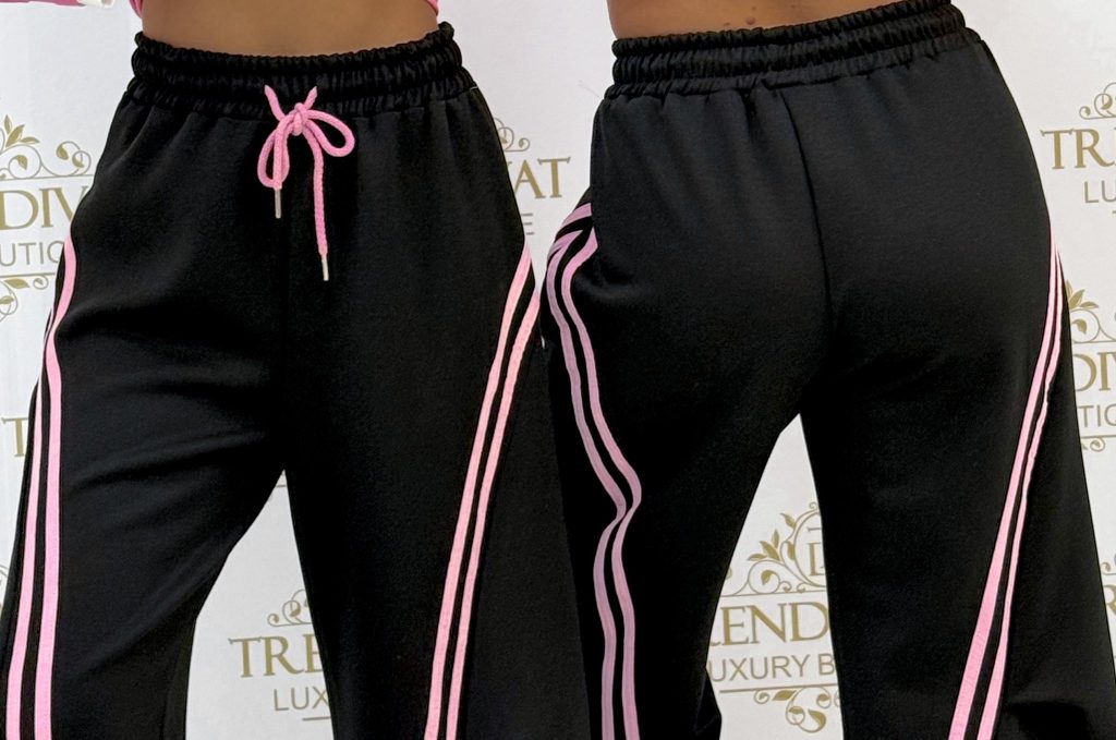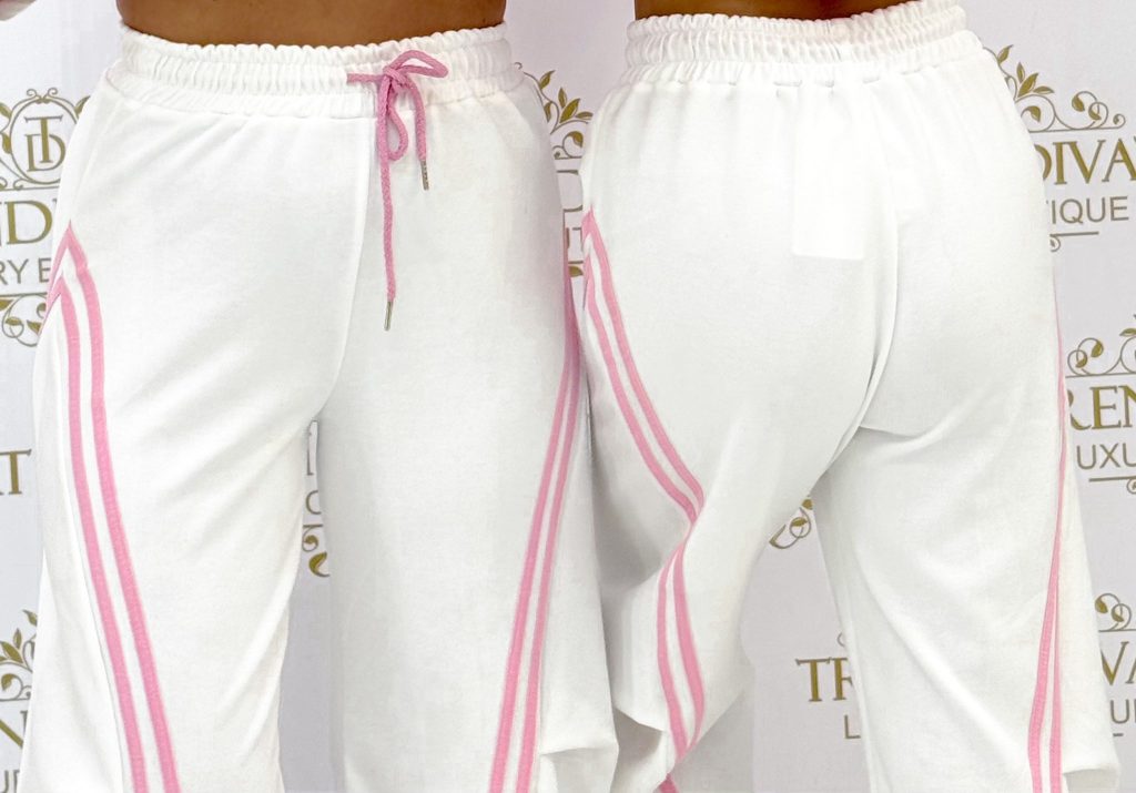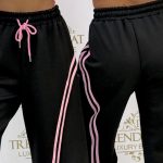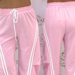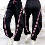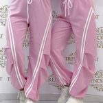 Pants with an elastic waist, side stripes, and legs that can be contracted at the bottom