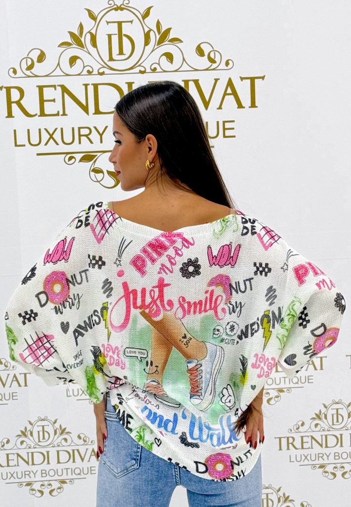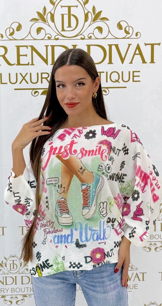 Be the first to review “Top with an inscription, unique pattern, colorful, T-shape, thread-knit material”