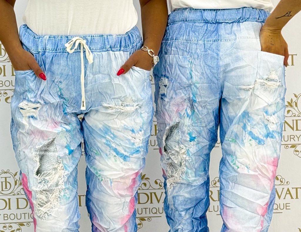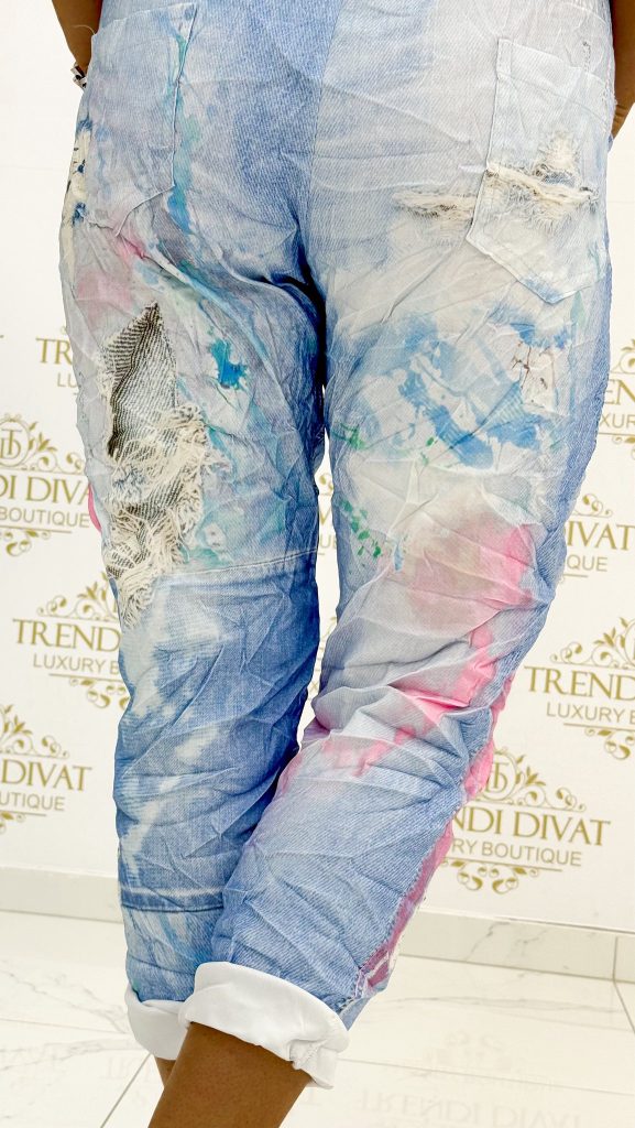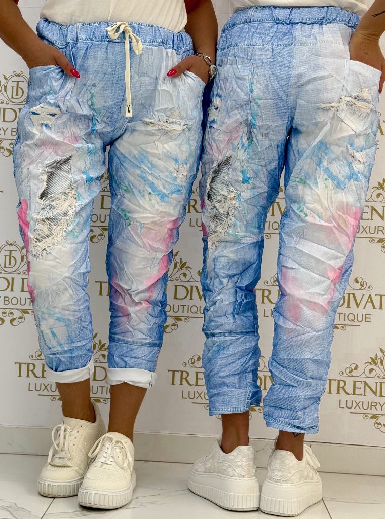 Be the first to review “Women’s pants with colored paint stains, worn, crumpled material, with elastic waist and ties”