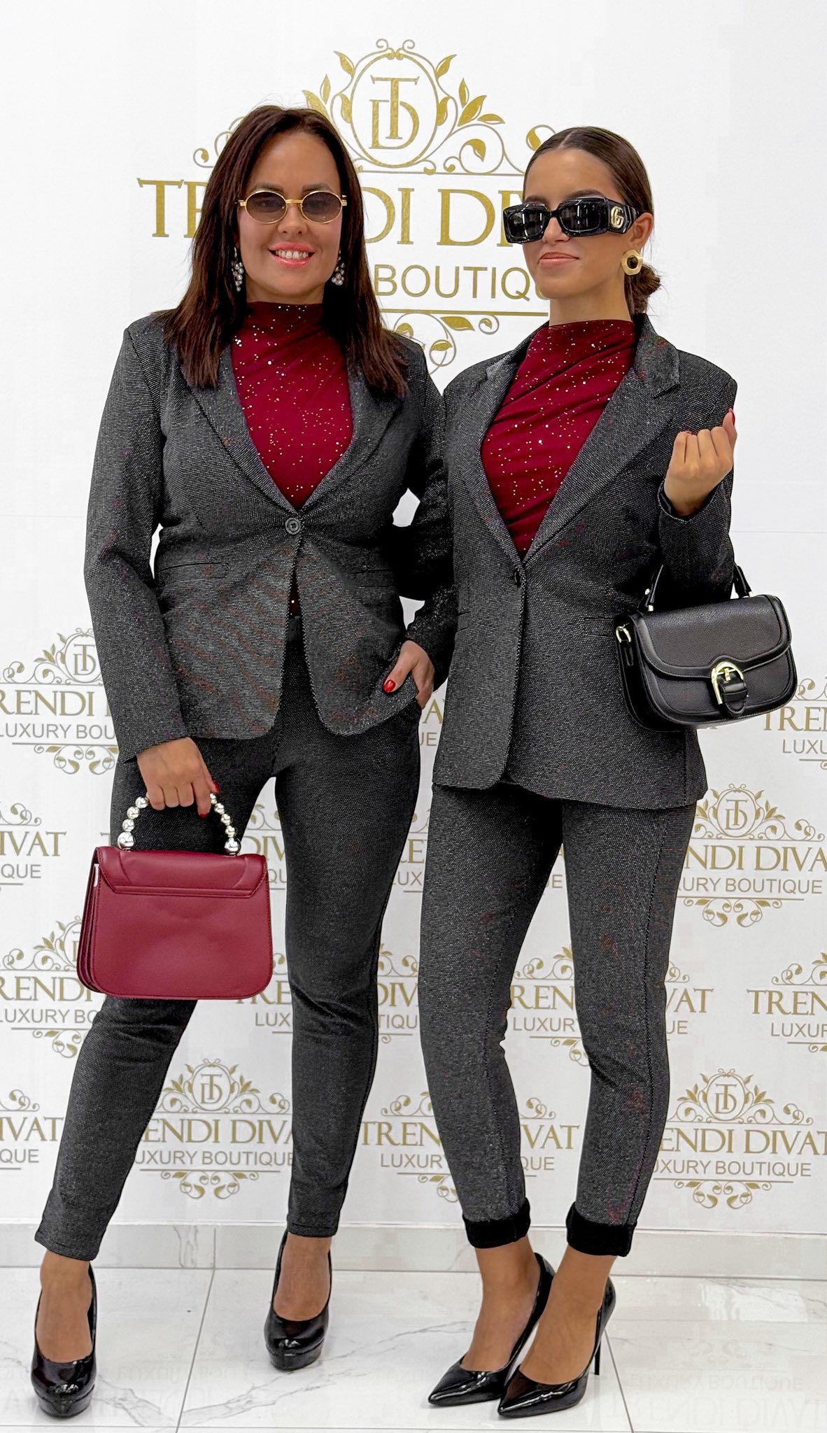 Silver-colored glitter blazer, decorated with unique gold-colored brooches