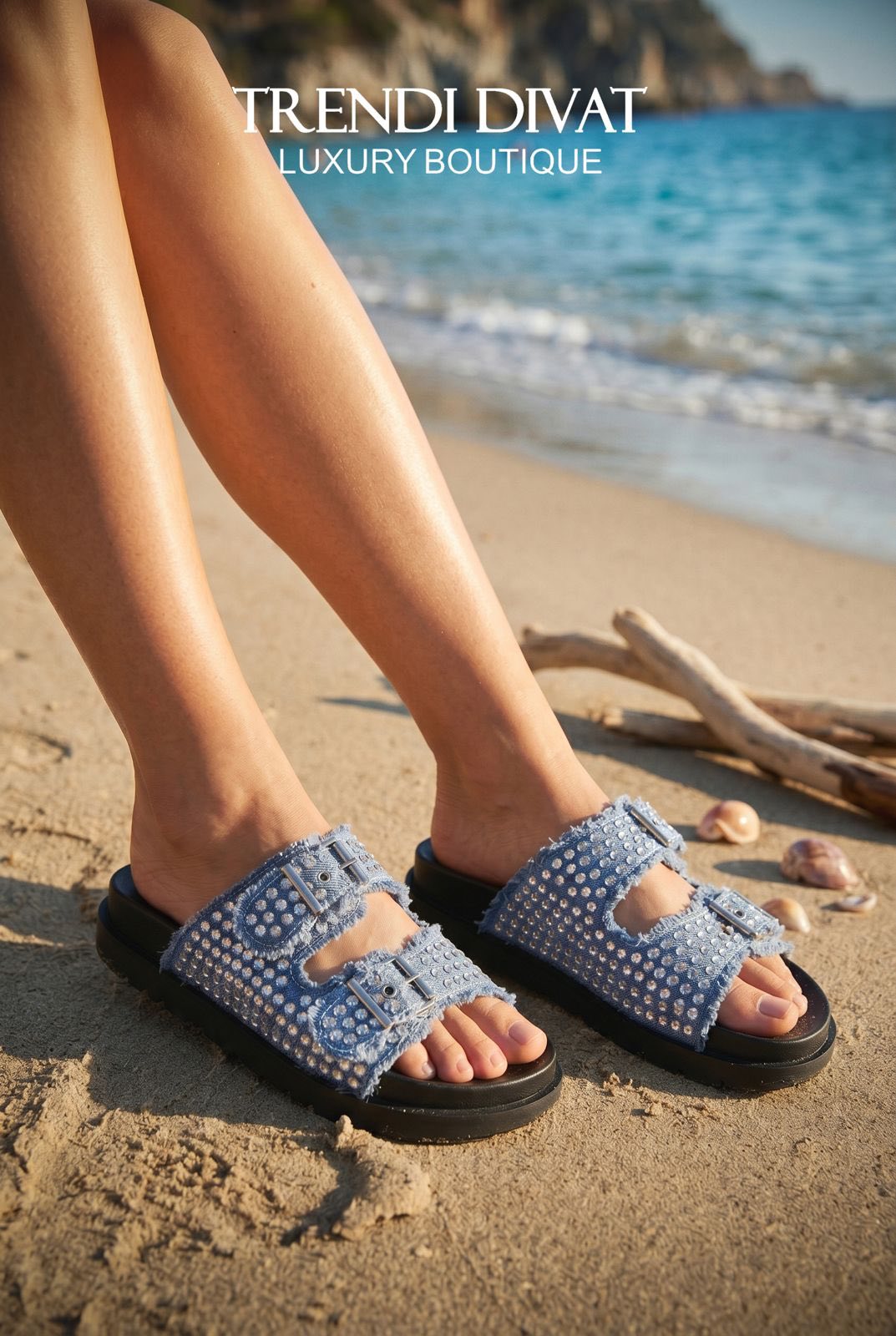 Dupla csatos, rojtos szegélyű, farmer papucs