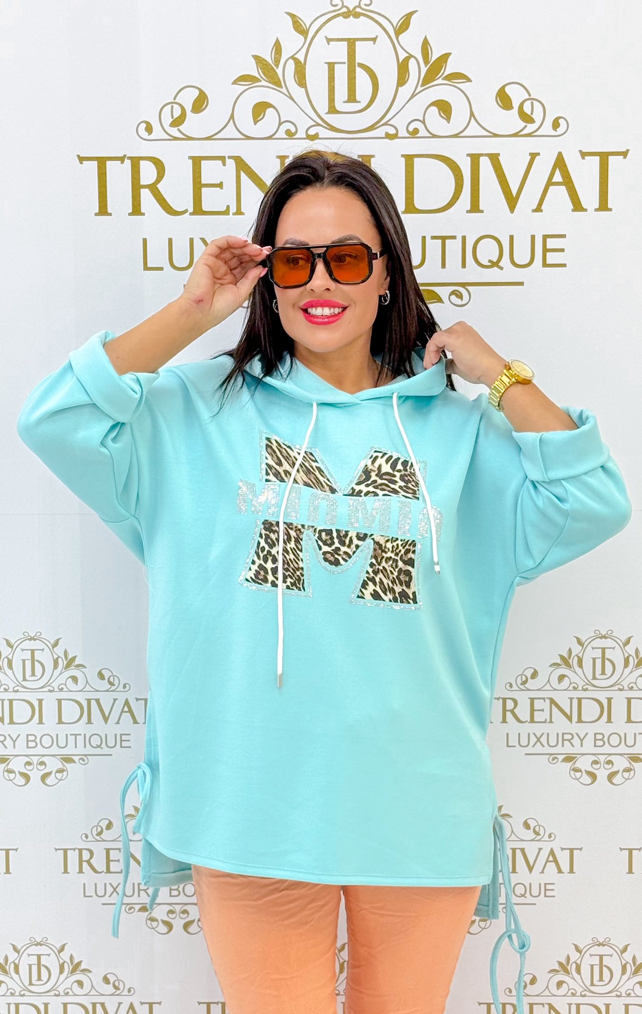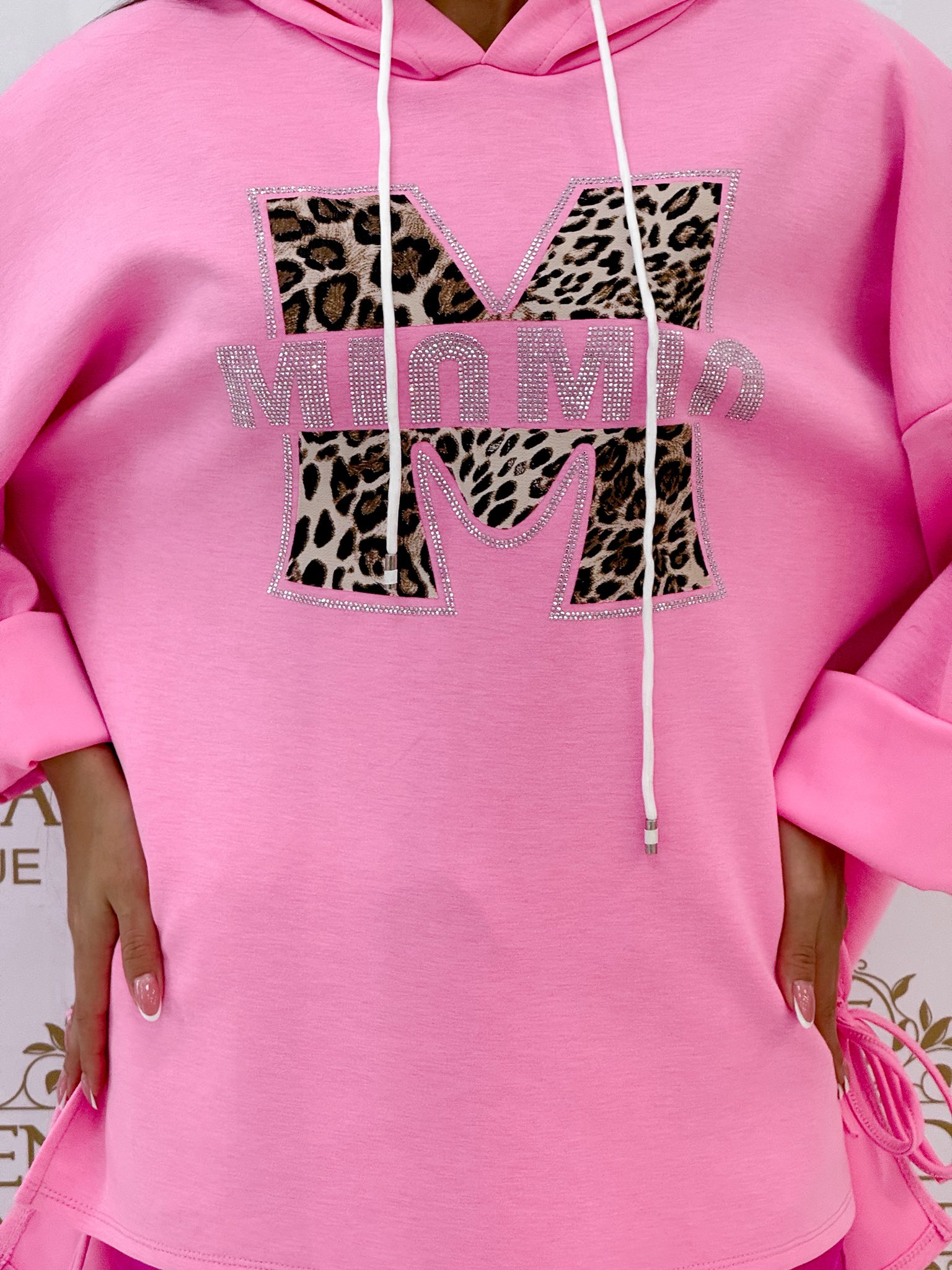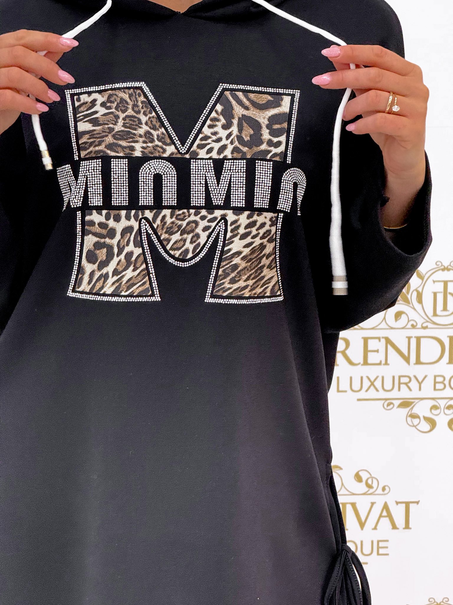 Kapucnis, oldalt megkötős, párducminta betétes, kövekkel díszített “MinMin” feliratos tunika