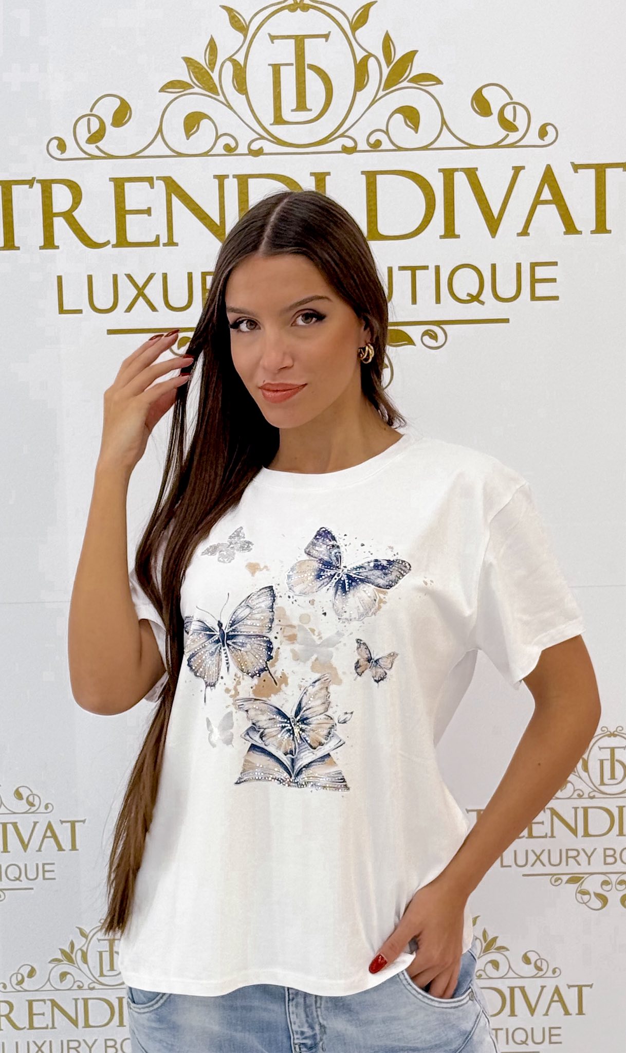 Kövekkel dísztett lepke mintázatú, laza fazonú póló