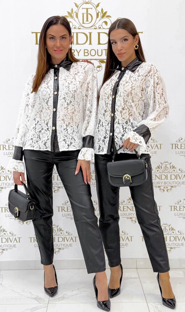 Műbőr betétes, tölcsér ujjú, csipkés kis blúz