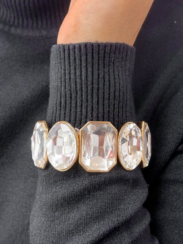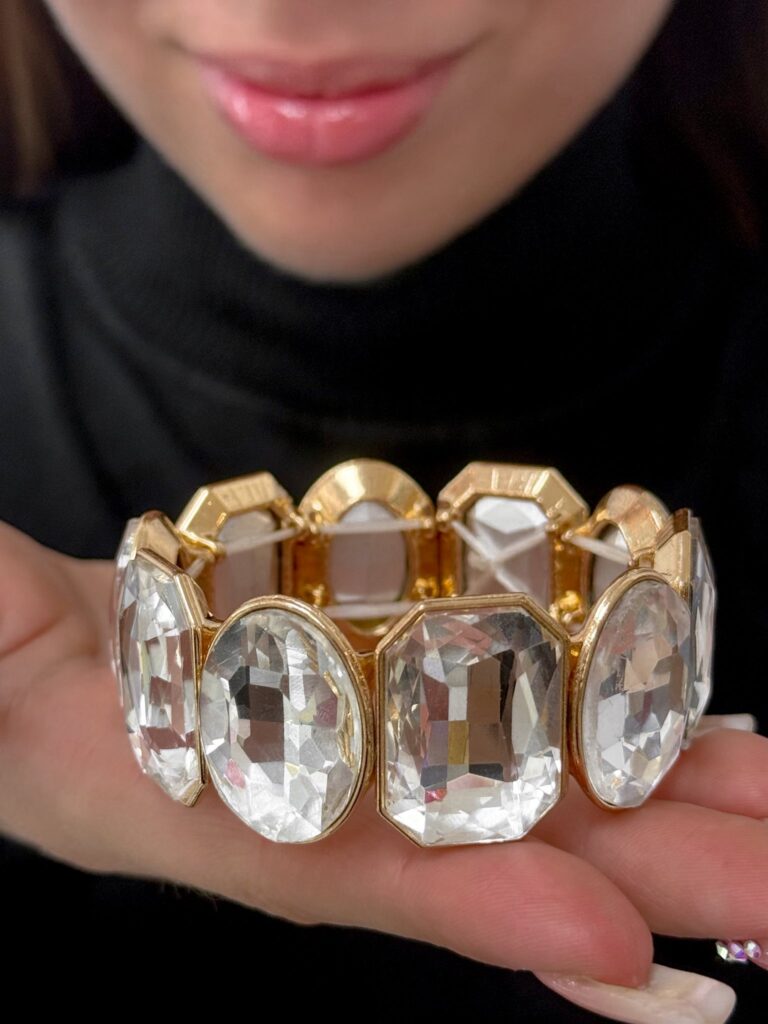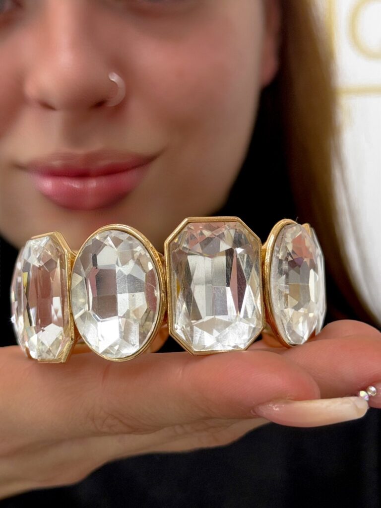Nagy ezüst színű kövekkel díszített, gumis karkötő