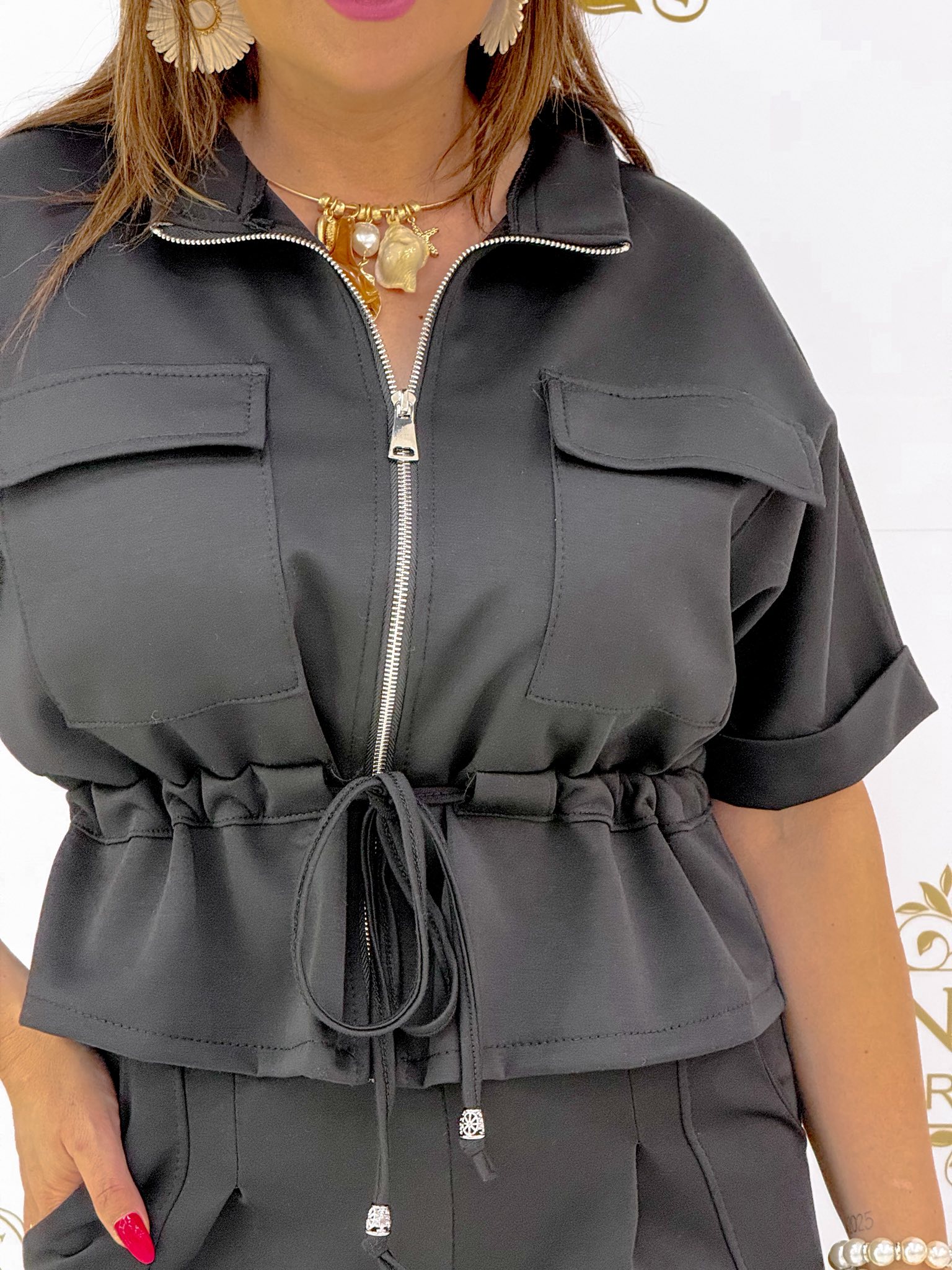Rövid ujjú, derekánál megkötős, cipzáras felsőrészes együttes