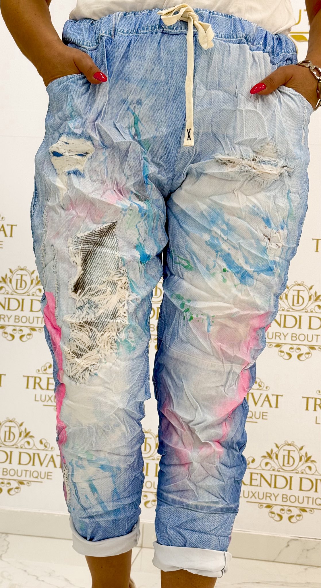 Színes festékfoltos, koptatott, gyűrt anyagú női nadrág, gumis derékkal és megkötővel