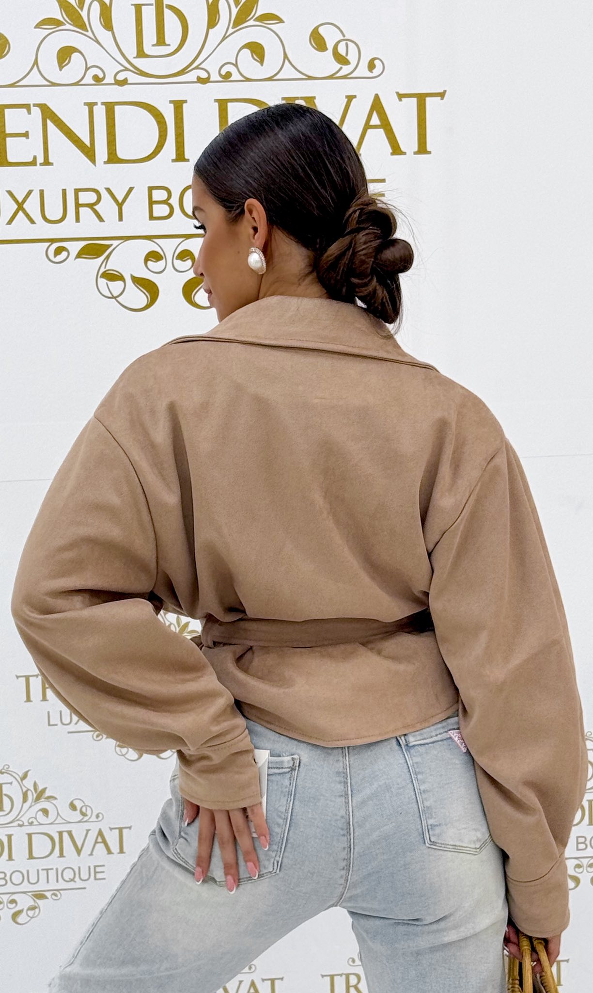 T-fazonú, galléros, patentos, velúr anyagú kis kabát, megkötős övvel