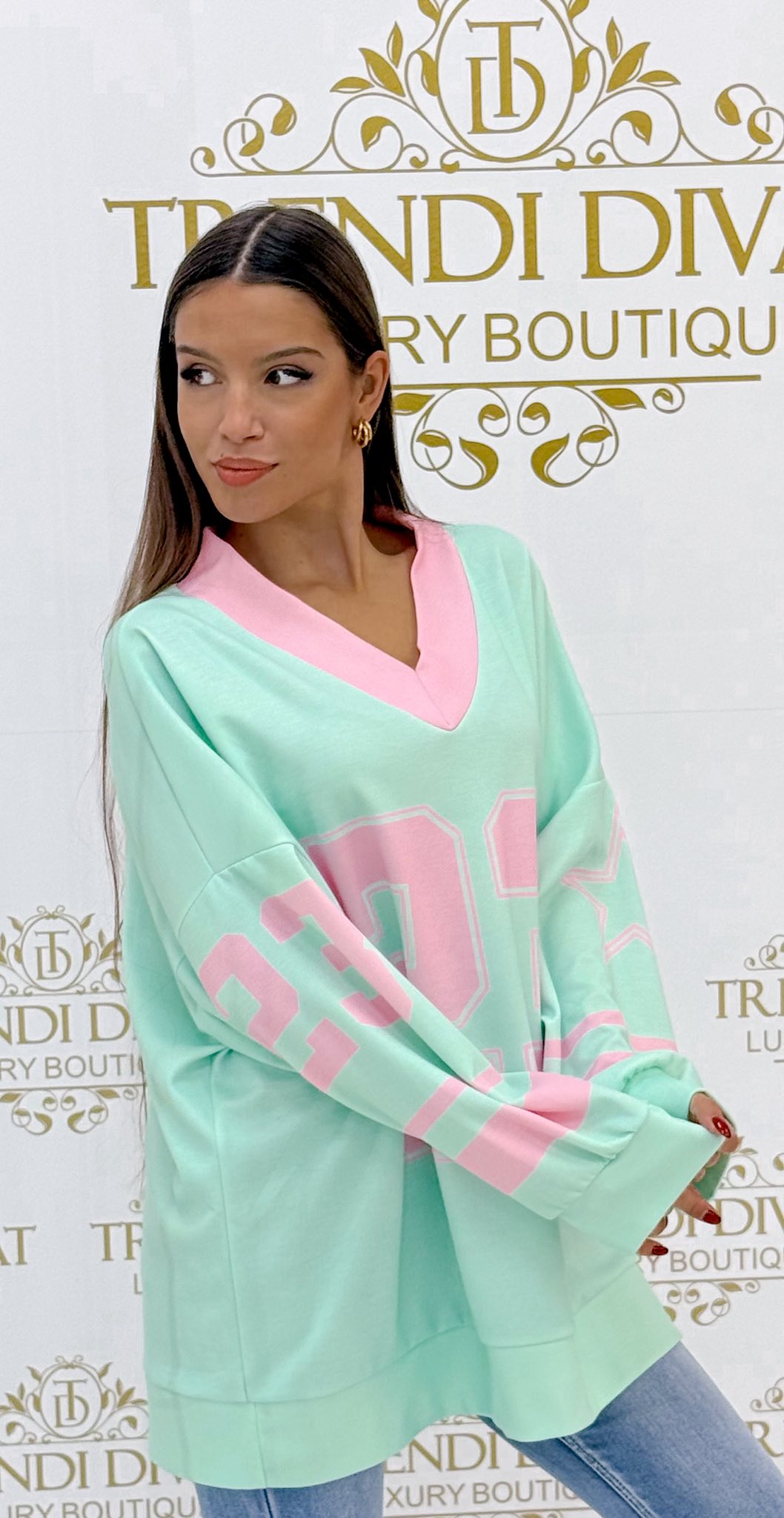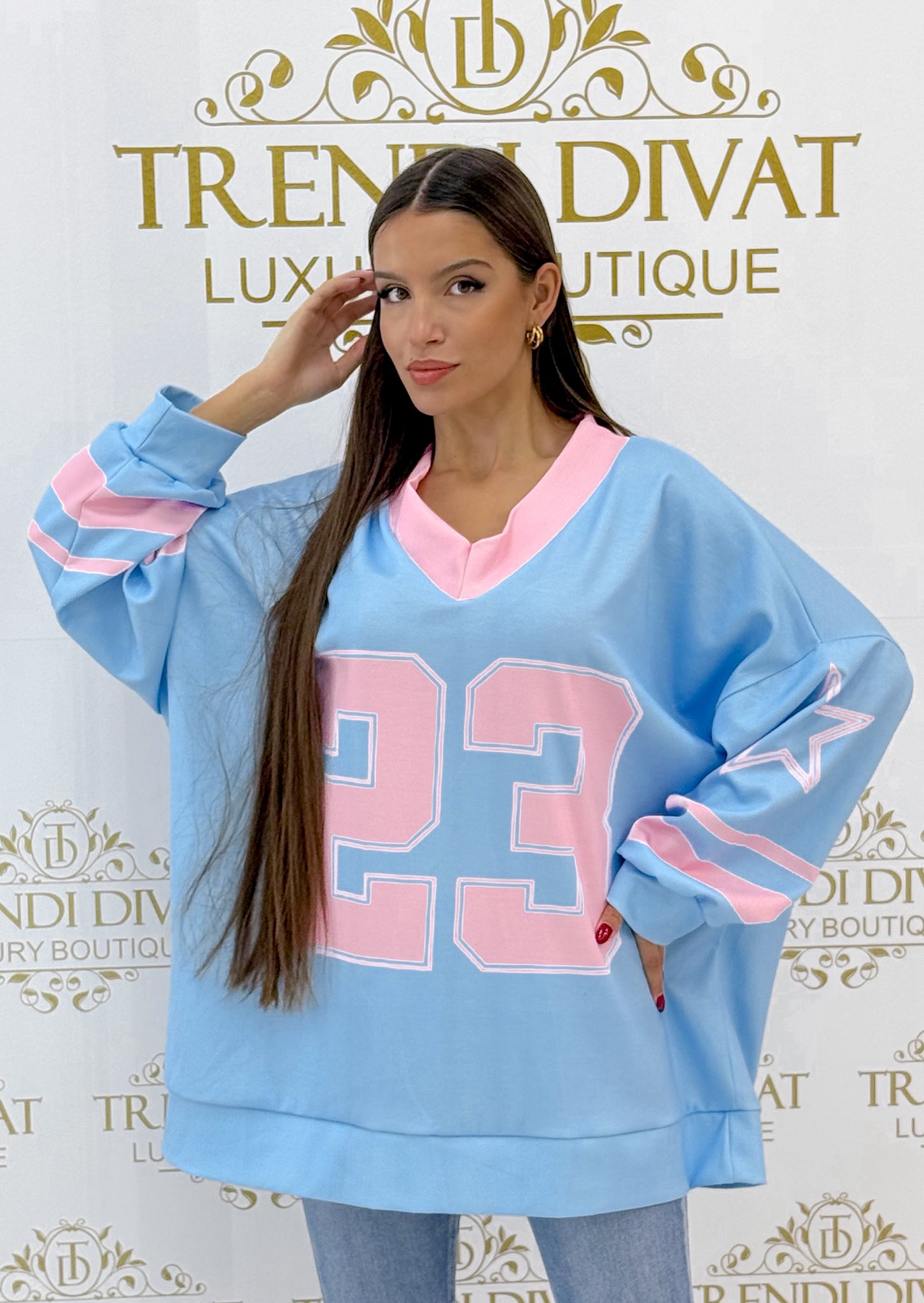 V-nyakú, “23” selyem hatású pulóver