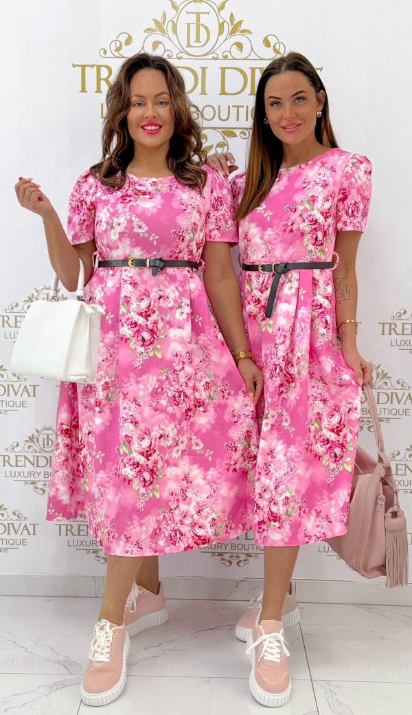 Virág mintázatú, cipzáras hátú midi ruha, ajándék övvel