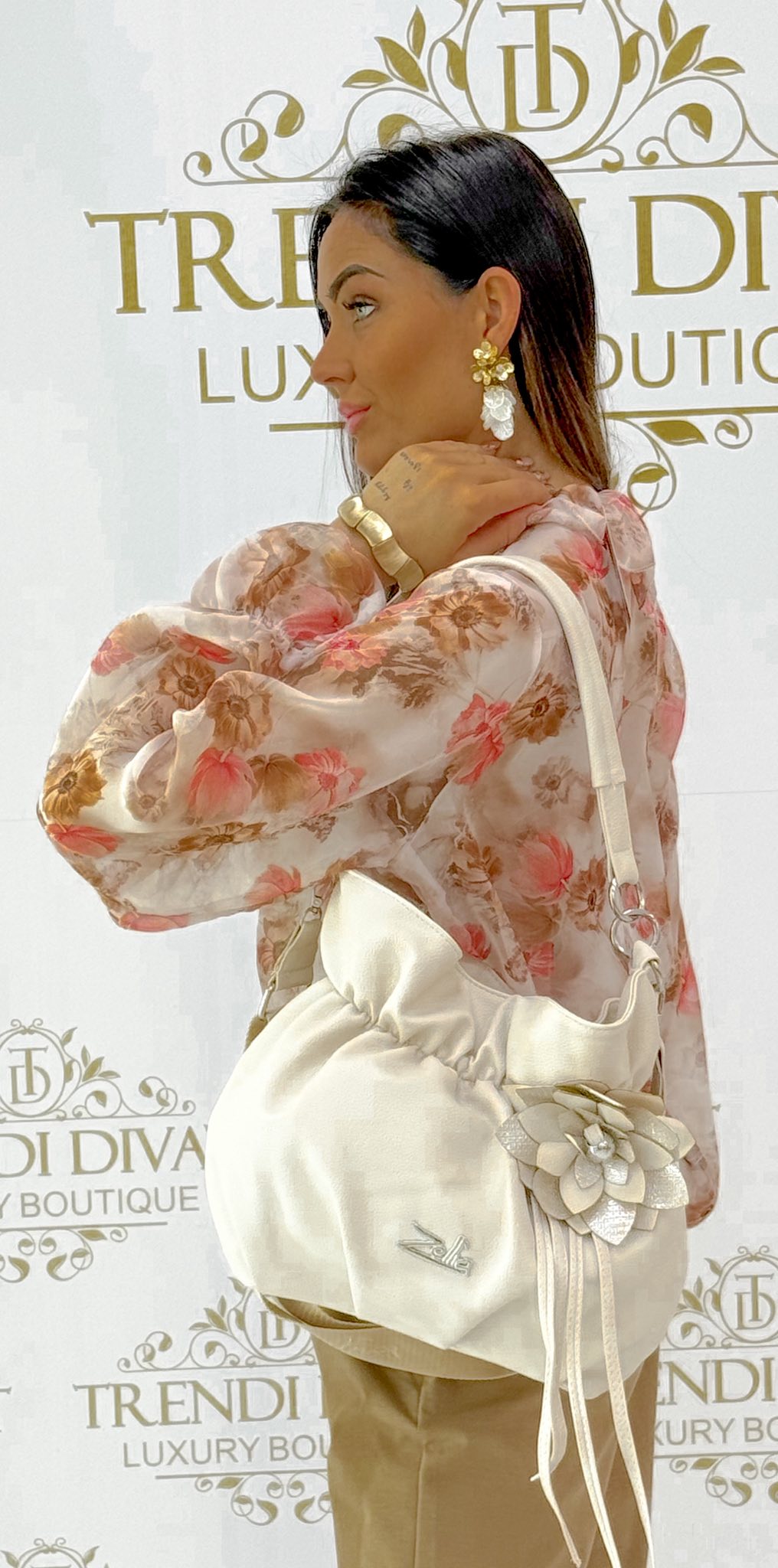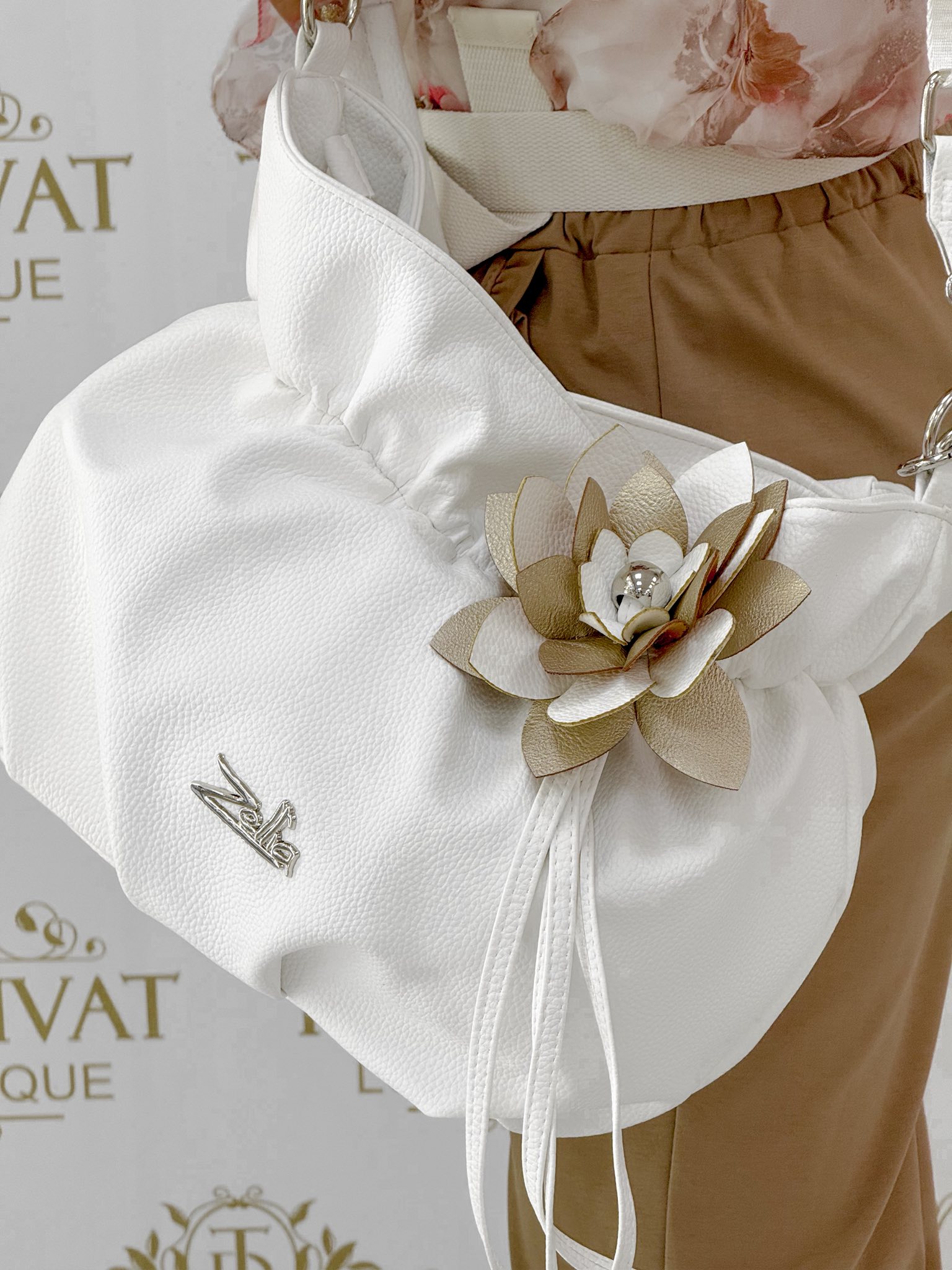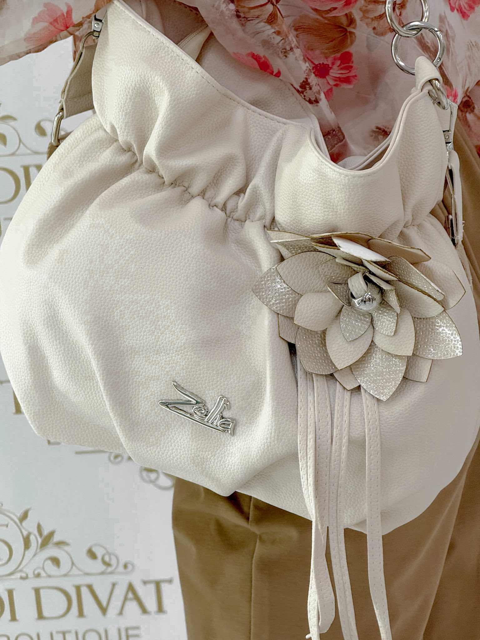 Zellia, húzott fazonú táska, nagyméretű virágdíszítéssel
