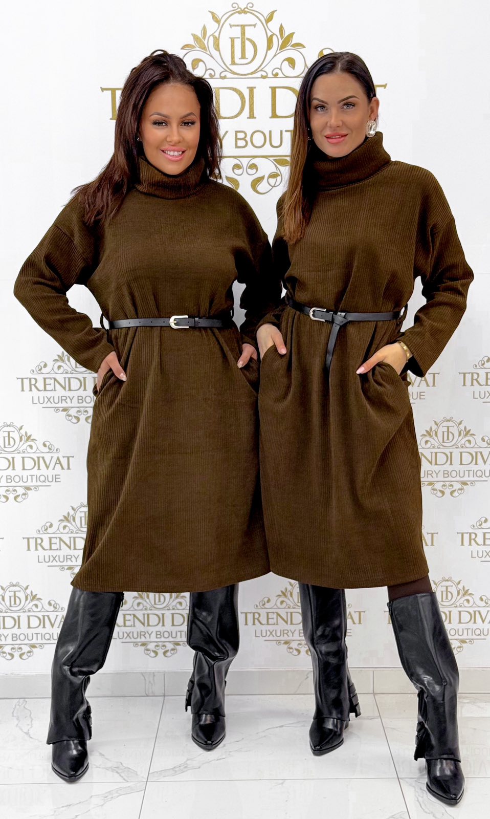 Bordázott vastagabb anyagú garbós fazonú zsebes ruha, ajándék övvel